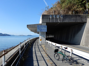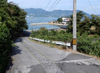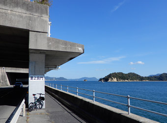 佐島南端には「Uターンブルーライン」と綺麗な海岸風景がありお気に入りスポットだが、佐島中部から南端まで続く長く狭い一本道を走る必要があり、アップダウンが多く疲れるしずっと木々に囲まれ景色もつまらないので今回はパス。佐島南部にも海岸沿いに周れる道路があれば良かったのだけれど。という事で佐島は北部だけを周って、それから生名島へ戻るため生名橋へ上がる坂道を上っている途中で、またもや太ももがつって痛みに苦しむ。一体どうしたっていうんだ、終始マイペースで走って大して体力は消耗していないハズだし、日差しが強いと言っても真夏と比べたら全然マシなのに。とにかくマイカーを置いた生名島の駐車場に帰着するまで、また太ももがつらないように気遣いながらローペースで、そしてもう痛い思いはしたくないとビクビクしながらペダルを漕ぐ。 |