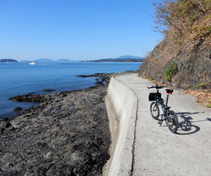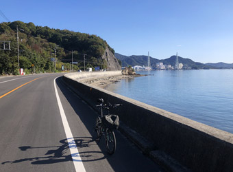 弓削島で一番のお気に入りスポットである砂浜海岸で脚を止めるも、相変わらず空は雲が多く日差しは遮られたまま。仕方なく景色が映えずガッカリしている自分を撮影していると、徐々に周囲が明るくなってやがて太陽が雲から姿を表す。お気に入りの海岸が綺麗で鮮やかな風景に変わり気分上昇。やっぱりこういう場所では晴れていないと損した気分になってしまう。自分にとってサイクリングはペダルを漕いで身体を動かすだけのものではなく、いい景色を楽しんでリフレッシュするための行楽なのだから。 |