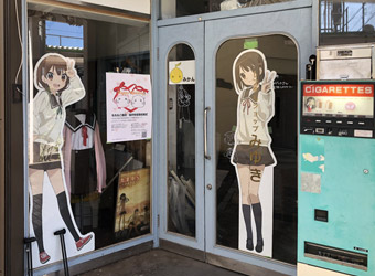 商店街の一角にある店に目が留まる。昭和を感じさせる外観にたまゆらキャラの等身大ポップが窓越しにふたつ、さらにたまゆらキャラが着ている制服のコスプレ衣装も展示。扉の横には「CIGARETTES」と書かれた見たことも無い古いタバコの自販機があり、しかし販売されているのはたまゆらグッズ。窓越しに店内を覗くと何やら物がいっぱい置かれていて、まるで倉庫のよう。「レンタルショップ」と書かれてあるが、雑貨のレンタルでもしているのだろうか。営業しているのかも不明、謎だらけの店だ。ともあれこういうちょっとした発見が面白い。 |