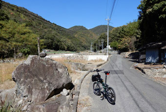 道筋を軌道修正して、以前は車で通っていた山道を自転車で行く。暫くは緩めの上り勾配がメインでミニベロでも難無く走れる道が続く。と言っても楽ではなくそれなりに疲れ始める。10月半ばにもなると日中の気温も落ちついたが、それでも自転車で山道を登っていると汗が出てくる。まだ半袖ジャージに短パンルックという夏の恰好で出て来て正解だった。 |