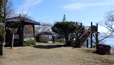 展望台は「山の展望台」と「海の展望台」のふたつあるが、両方行くのは面倒なので眺めの良さそうな海の展望台だけにする。整備された階段道を暫く上ってたどり着いた海の展望台には、円すい状の骨格に囲われたウッドデッキが。これは一体何だろう、シートでも被せてテントみたいにするのだろうか。そしてお目当ての展望台からの眺めはというと、確かに海を一望できる眺めではあるが特にインパクトは無し。まぁいいさ、ついでに寄っただけだから。 |