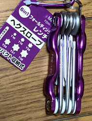 商品が到着して早速換装作業をしようと、ホイールにローターを固定しているネジを外そうとしたところ…あれ、六角じゃくて星型じゃないか!ぱっと見は六角ネジ(正式には”六角穴付きボルト”)に見えたが、マイナーな星型ネジ(”トルクスネジ”又は”ヘクスローブネジ”などと呼ばれているらしい)だった。星型ネジ用のレンチは持っていなかったので、急遽自宅から車を走らせ閉店間際のホームセンターへ(仕事から帰宅後の作業だった)。しかし星型ネジ用のレンチは商品自体が少なく、必要なサイズ「T25」の単品レンチが売り切れていて焦る。それからT25を含む携帯用のレンチセットを見つけて購入。 |