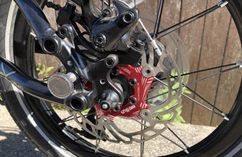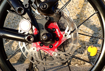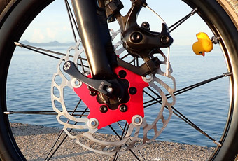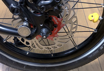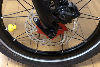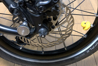 パーツも工具も揃った、今度こそディスクローター換装作業開始!まずはフロントタイヤから始めるが…あれ、ローター中心部のプリントされている面が裏側になってしまうぞ!?ここである事に気付く。基本的に自転車のディスクブレーキはタイヤ左側に付いているものだが、K9Xは折り畳み機構の関係でフロントディスクブレーキが右側についている。そのためローター表の左面が裏になってしまうのだ。そんな事まで気付かなかった。ディスクローターは回転方向が決まっているので表裏逆に取り付ける事はできない。という事で、フロントタイヤのディスクローターは無地の裏面が表になり、2枚のプリントデザインが違う事など問題ではなかった。。 |