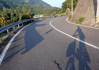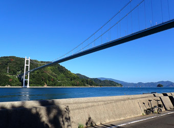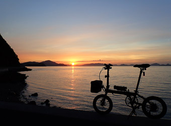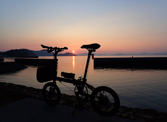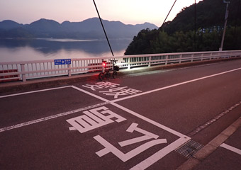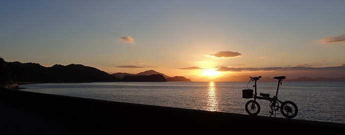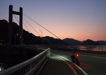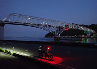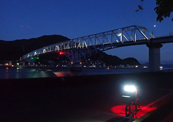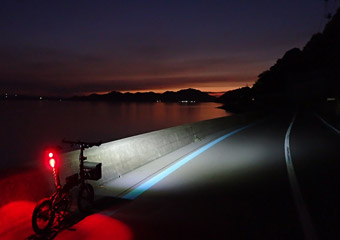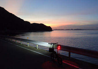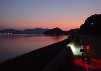 初めて夜明け前からのサイクリングをした時は暗闇の中をライトを照らして走るのが新鮮で楽しかったが、もうさすがに新鮮味も無くなり景色の見えない夜道を淡々と走る。あぁ、いい加減とびしま海道の暗闇サイクリングも飽きたな、と思った。 |