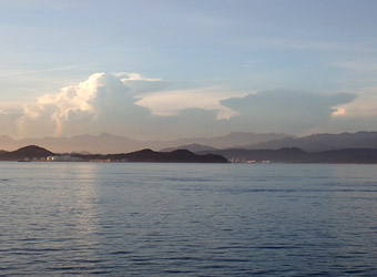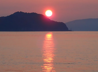 この日は晴れ時々曇りの予報で朝日が見られるか少々不安があり、実際に東側には広範囲に薄雲が広がっていたが、運良く今回も日の出から間もない朝日を拝むことができた。南の対岸に広がる四国の陸地は巨大な積乱雲が覆い被さっているし、かきしま海道がある西側も一面雲に覆われていて、とびしま海道周辺の空だけ雲の無い快晴。自分の晴れ男ぶりに感心してしまう。 |