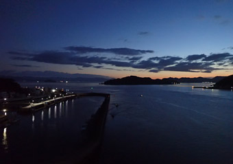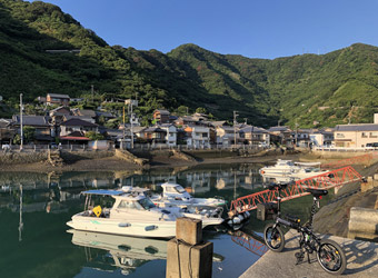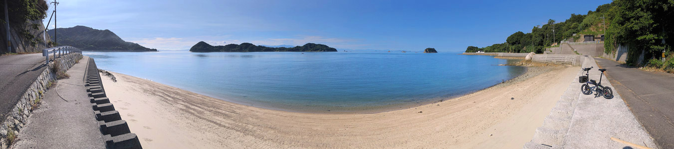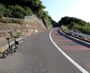 前回までの夜明け前サイクリングで朝日を眺めた場所は、豊島・大崎下島・岡村島のいずれも北岸側。毎回同じような場所からでは面白くないので今回は南岸側から朝日を見たいと思い、日の出・日の入りに関する情報が分かるサイトで朝日が見られる場所を確認したところ、大崎下島南岸の大部分から見られる事が分かった。という事で、大崎下島に入ったら豊浜大橋の下を通って南岸沿いの道路へ回り込み、島を反時計回りに進む。とびしま海道サイクリングの往路で大崎下島の大回りルートである南岸を走るのは多分今回が初めて。 |