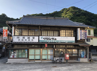 朝日を眺めながら引き続き大崎下島を反時計回りに進み、御手洗町並み保存地区の前を通過。毎度のとびしまサイクリングに少しでも変化をつけようと、普段は寄らない山あいの集落を軽く散策。一番の目当ては大崎下島唯一のコンビニ的商店。創業100年以上で現在の建物は築100年近くになるらしい。この商店の存在は2012年に上映されたアニメ映画「モモへの手紙」を観て知った。 |