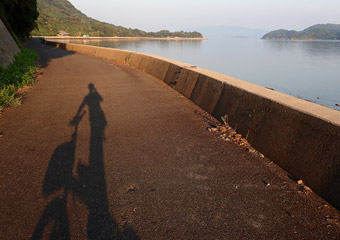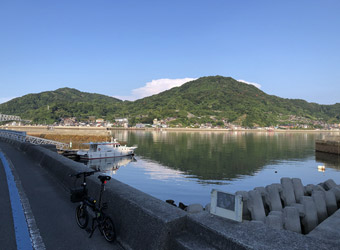 引き続き岡村島を反時計回りに進み、岡村港を通過して島の北岸へと回り込む。背中に朝日を浴びながら岡村島をぐるっと一周し、大崎下島まで戻って最短縦断コースを引き返す。何度も何度も繰り返し走っているコースなので、やはり流石に飽きが来て楽しさもリフレッシュ度も減少。連続12度目のとびしまサイクリングなので当然だ。 |