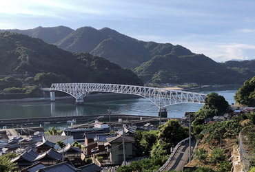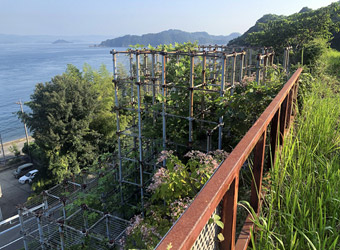 苦手な坂道を上り切った先にある土産物屋「であいの館」に寄り道。自販機でジュースを買って飲みながら、何となく建物の周りを歩いてみる。であいの館には休憩のために何度も訪れているが、周りを歩くのは意外な事に今回が初めて。で、長い階段道の先にある展望台を発見したので行ってみる。高台に建つ展望台からは対岸の下蒲刈島や蒲刈大橋、周囲の海を一望できる眺め。またしても上蒲刈島で新たな場所を発見。 |
