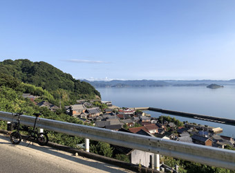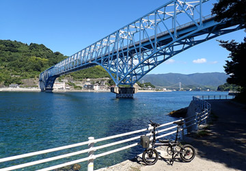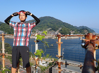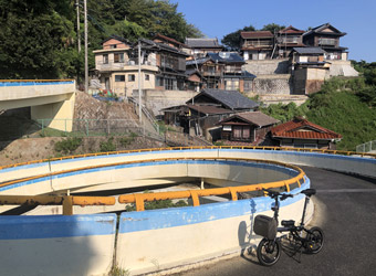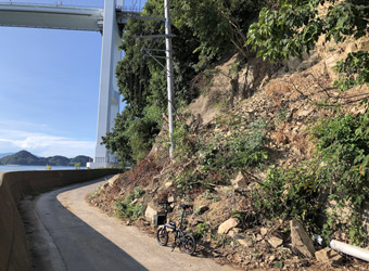 豊浜大橋を渡って豊島まで戻り、次はお気に入りスポットのループ橋に寄り道。いつもは橋を上って写真を撮ったら下へ戻っていたが、今回初めてループ橋の上から続く細道に進入。連続12度目のとびしま海道サイクリングを楽しむためには、初めての場所や道路を開拓していく必要がある。 |