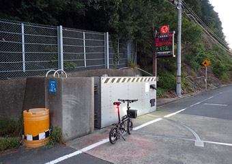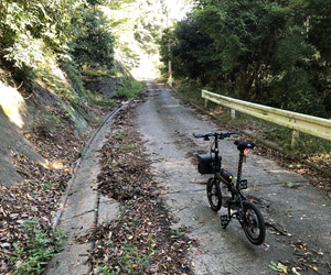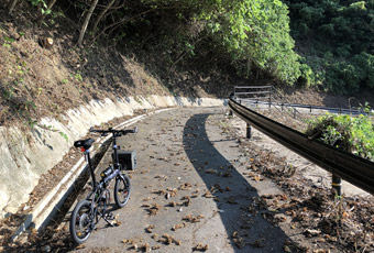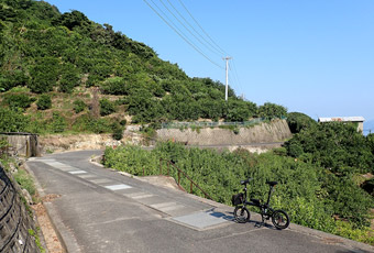 豊島大橋を渡ると直ぐにトンネルがあり、復路で上蒲刈島大回りルートに行く時はいつもトンネルを抜けた先で道を折れていたが、今回は豊島大橋とトンネルの間にある横道から大回りルートの東端へ下りる。この横道を通るのは今回が初めてで、ずっと前から知ってはいたが道路の状態が悪くて通行は避けていた。前回のサイクリングで目にした時も草木が生い茂り地面は枝葉が大量に散乱していて、とても自転車で通行できる状態ではなかった。ところが今回は木々が伐採され初めてスッキリしているのを見たので、通ってみたくなった。 |