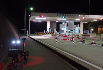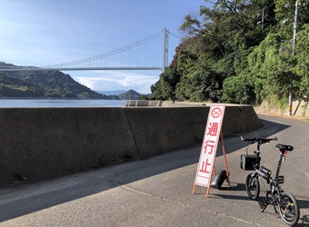 大崎下島南岸沿いの外周路に回り込み朝日が昇る東側の空が見えるようになると、広範囲に雲が広がっている事が分かりガッカリ。流石にこの雲では日の出直後の朝日は見られないだろうと諦める。そして途中で道路を封鎖するゲートに差し掛かる。何度も通っている道なのにこれまでゲートの存在に気付かなかった。幸いゲートは開いていたが、ゲートにある電光掲示板にも通行止と表示。何故だ?電光掲示板の消し忘れか?とにかく道路が封鎖されていなくてよかった。背が高くしっかりしたゲートで道路脇に隙間もないので、自転車を担いで強行突破するのは不可能だ。 |
