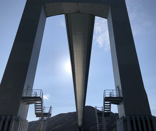 西南岸の道はだだっ広い場所を横切り海から離れ、そして蒲刈大橋へ上がる坂道に行き着く。この急勾配の坂を上るのだけは未だに身構えてしまう。復路の終盤というタイミングにはしんどい急坂だし、車道が狭くて自転車でノロノロ走るのは危ないので仕方なく激狭な歩道に毎回入っているし。この坂道だけは何度走っても慣れそうにない。 |