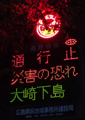 前回同様今回も大崎下島から朝日を見ようと思い、豊浜大橋を渡って大崎下島に入ったところで南岸沿いの外周路へ向かうが、「通行止 災害の恐れ」と赤く光る電光掲示板に目が留まる。台風は2日前に通過したし、そもそも広島は大雨にならなかったのに何故??と納得いかず。この先に道路を封鎖するゲートがあった記憶は無く、とりあえずそのまま先へ進む事に。もし途中で道路封鎖されていて引き返すハメになったら、それはそれでネタになるし… |