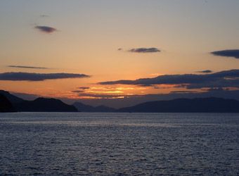 南岸沿いの道路を東に向けて進んでいくと、印象的な朝焼け空が視界に広がり一気に気分は上昇。空がオレンジに染まった部分とそうでない部分で直線的に分かれている。なかなかインパクトのある光景だったが、写真には収まり切らず壮大さが伝わらないのが残念だ。5:40に遠くの対岸に広がるしまなみ海道の島々の背後から朝日が顔を出す。 |