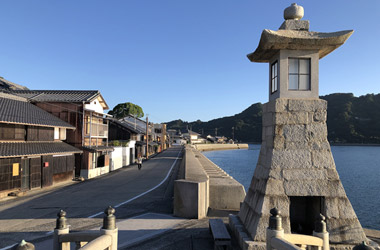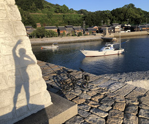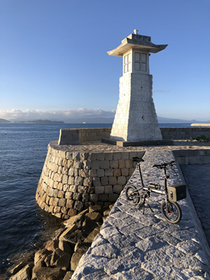 久し振りの高灯籠も波止から眺める町並み保存地区の家々も、朝日を浴びて黄金色に染まりいい雰囲気。しかも周囲に人の姿は無く独り占め状態。居心地がいいので写真撮影を楽しみながら30分ほど時間を費やす。普段のサイクリングでこんな贅沢な観光ができるなんて、サイクリストとして自分は本当に恵まれているなと思う。そして12年前に東京から広島へ移住して正解だったと改めて思う。 |