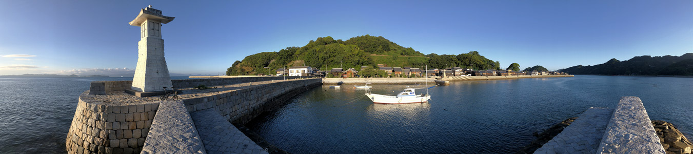 << SCROLL 御手洗町並み保存地区の波止と高灯籠 パノラマ写真180° SCROLL >> |