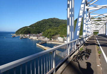 続けて前回発見した上蒲刈島西南端の波止にも寄り道し、蒲刈大橋の下を通過して西南端をぐるっと周る細道を走行。今後とびしま海道サイクリングの復路で上蒲刈島の北岸沿いを走る時は、二箇所の波止に寄り道するルートが定番になりそうだ。 |
