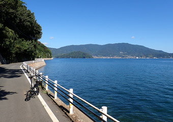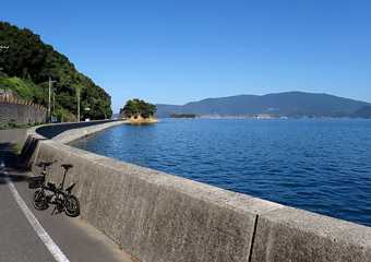 斜面崩落現場を突破し、豊島大橋の下を通って、上蒲刈島東岸沿いの道を南下して行く。空も海も夏らしい濃く鮮やかな青色をしていて視覚を刺激する。綺麗で長閑で本当にいい眺めだ。しかしとにかく暑い、少々危険な暑さだ。それでも彩度の高い瀬戸内風景を楽しみながらのんびりペダルを漕ぐ。こんなにいい風景を足早に通り過ぎてしまうのは勿体ない。 |