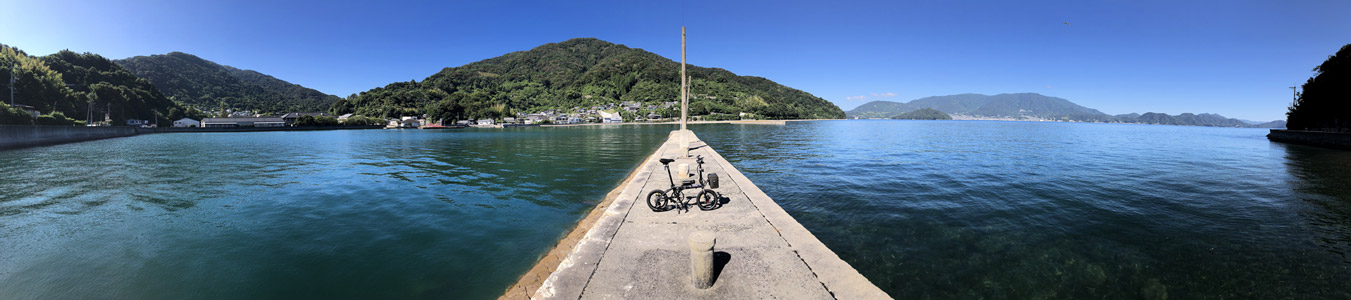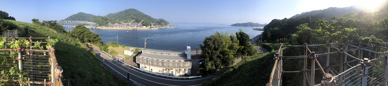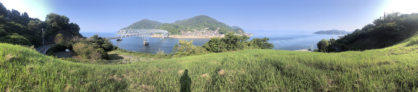 今回は上蒲刈島でもう一箇所初めて通る道へ。島の西南端に位置し、蒲刈大橋の下を通る海岸沿いの道をぐるっと周ることにした。ここもメインコースから外れる横道で、これまで目に留まる事も無かった。そんな道へ折れたところで景色のいい波止をまた発見。対岸の下蒲刈島を挟んで左手に蒲刈大橋と右手奥に安芸灘大橋が見えるパノラマ風景。ロードバイクに乗っていた頃から数えて何十回と走っているとびしま海道でも、未訪問の穴場的な場所がまだまだあるのだと改めて知らされた。 |