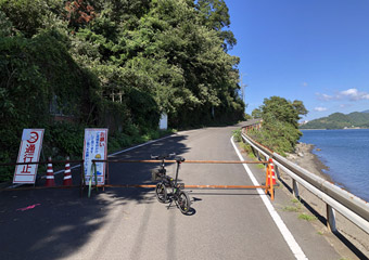 引き続き上蒲刈島北岸沿いの道を進み、6月半ばから通行止めの区間をいつも通り突破。特に問題無さそうに見えるがまだ修復工事は完了していないのだろうか。それにしてもとびしま海道は斜面崩落の修復工事が遅過ぎる。作業者不足なのか、それとも予算の問題か、何が原因で工事が全然進まないのか気になる。 |