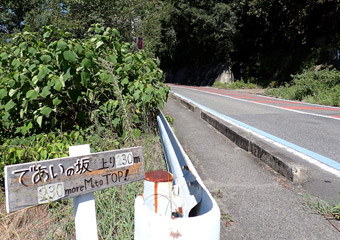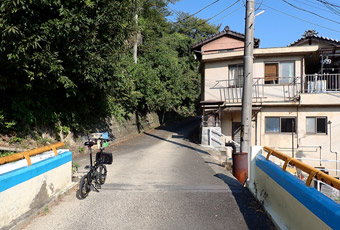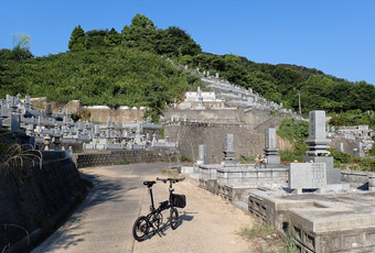 ループ橋から続く細道は住宅を抜け、高台中腹に広がる墓地と農地を通過し、そのまま高台中腹に続いていく。基本的にこの道路を利用するのは地元農家の人か道路沿いの居住者だけと思われ。特に何があるというわけでもないが、初めての道から初めての風景を眺めながらのんびり走るのは楽しい。これぞポタリングという感じ。 |