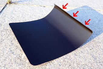 何とか接触を回避する方法はないかと考え、サイクリング中に底板を改良。バッグ底側の端に折り目をつけて強度を上げてみた。するといくらかはマシになった気もするが、やっぱり大きめのギャップ通過時はバッグ底がタイヤに接触してしまう。うーん、もうどうしようもなさそうだ。まぁ頻繁に接触する訳ではないし生地が破ける程でもないので、あまり気にしない事にした。 |