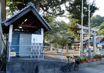 復路で大崎下島を走行中に便意をもよおすようになったので、目に留まった神社の公衆トイレへ。9月に入ってからどうも腹の調子が良くない。いつまでも暑くて夏バテ気味で身体が疲れているのかも知れない。子供の頃から暑いのは本当に苦手なんだ。ともあれとびしま海道には何気に公衆トイレが多くて助かる。しかもどのトイレもしっかり管理されていて綺麗なのでありがたい。 |