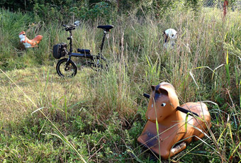 本来はジャングルジムを上り下りして公園と下の坂道を行き来できるのだが、現在は雑草に埋もれ強度も不十分で不可能な状態。どうしてこの公園はこんな風に廃墟化してしまったのだろう。公園を訪れる人もグラウンドを利用する人もあまりいなかったから |