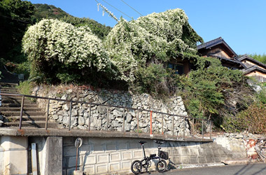 細道を進み続けて民家が並ぶ集落に入り、緑と白い植物に覆われた家屋に目が留まる。まるで植物に飲み込まれかけているような光景。流石に廃屋だろうか。こういうちょっとした発見もサイクリングを飽きさせない大事なイベント。 |