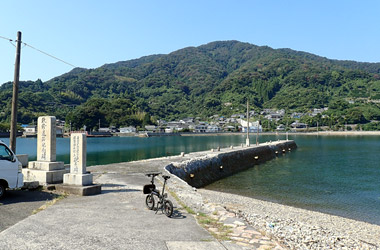 暫く朝日を眺めてから引き続き南岸沿いを進み、御手洗町並み保存地区のランドマーク的な存在の高灯籠へ。高灯籠は海へ長く突き出た石積みの波止の先端にある。この波止の地面がかなりボコボコしていて、自転車を漕いで高灯籠まで行くのは不可能。それどころか自転車を押して行くのも少々困難なので、これまでサイクリング中に高灯籠まで行く事はほとんどなかったが、今回は是非とも立ち寄りたい気分だったので自転車を担いで歩いた。 |