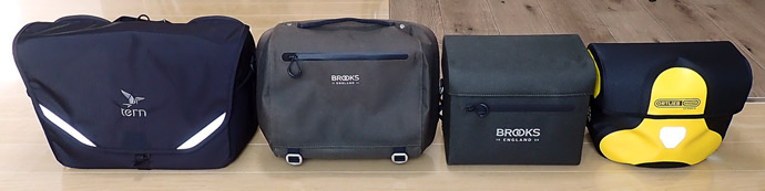 所有する小径折り畳み自転車Tern Verge N8とDAHON K9Xに装着できるフロントバッグは4つになった。購入順にTern GO-TO BAG(15L)、BROOKS ハンドルバーコンパクトバッグ(10L)、BROOKS ハンドルバーケース(8L)、そしてORTLIEB アルティメイト6 クラシック(7L)。新たに購入する度にバッグ容量は少なくなり、バッグのサイズも小さくなっている。大きい方が当然沢山荷物を入れることができて便利ではあるが、小さい方が自転車に装着した時のまとまり感がある。 |