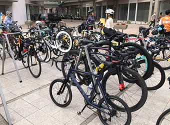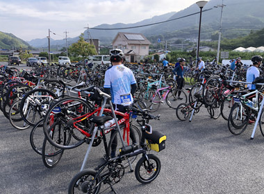 トイレに少しの間並んで用を足して、駐輪場に戻ると満車で置き場を探し回る参加者が多数。到着時は数えるほどしか駐輪されていなかったが、本当にあっという間にエイドステーションは大混雑。ハイペース走行を続けて第1エイドに早く着いて正解だった。 |