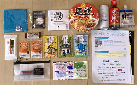 帰宅したらまず参加記念品が入った袋を開封。飲食物・ハンドタオル・入浴剤・タイヤレバー等々色んなものが入っているが、正直ほとんど不要なものである事は前回と変わらず。特に焼き肉のたれは自炊しない自分にとって使い道に困る。。記念品を片づけてからゼッケンの取り付け作業。ヘルメットにシールタイプのゼッケンを貼り、サイクルウェアの背中には大きめのゼッケンを安全ピンで留め、そして自転車の前面に取り付けるゼッケンはちょっと拘ってみた。 |