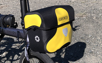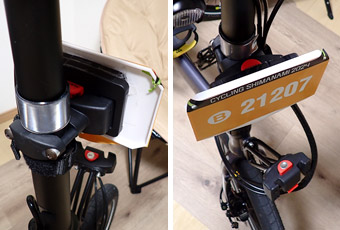 自転車用ゼッケンはハンドルやブレーキケーブルにビニタイで括りつけるタイプのもので、取り付け方が悪いと見え辛くなったり走行中にヒラヒラしたりするので、そうならないようにしっかり取り付けたかった。そこでハンドルポストに付けっ放しのフロントバッグアダプターと、反射シールを貼って一度使っただけのアダプタープレートを利用。自宅にたまたまあったゼッケンとほぼ同サイズの樹脂プレートをアダプタープレートに貼り付けて、そして樹脂プレートにゼッケンを貼ってハンドルポストのアダプターに装着。これならハッキリとゼッケンの数字が見えるしヒラヒラしたり外れる事もない。 |