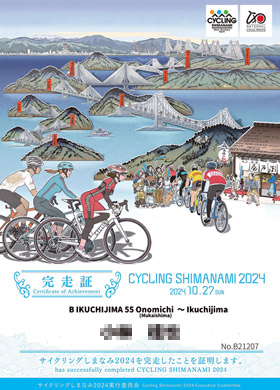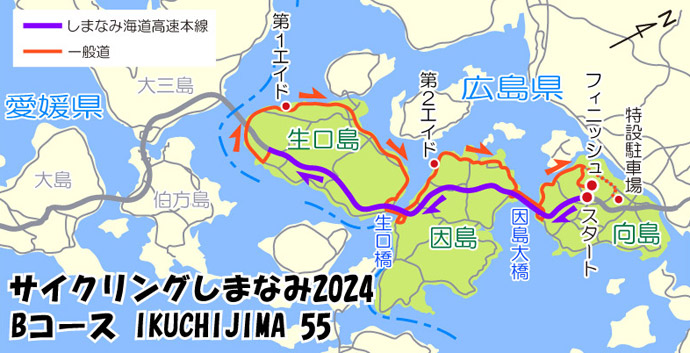 サイクリングしまなみ2024はA〜Hコースの8種目あり、自分は走行距離55kmでスタート会場が尾道市向島の「Bコース IKUCHIJIMA 55」にエントリー。2018年にロードバイクで参加した時は走行距離110kmでスタート会場が今治市の「Eコース IKUCHIJIMA 110」にエントリーしたが、今回は16インチタイヤのK9Xで参加するので走行距離は控えめにし、会場が自宅から近い向島スタートの種目を選んだ。自宅から今治までは車で約160kmの道のりがあり2時間は掛かるので、イベント帰りの車の運転がしんどいから。。 |