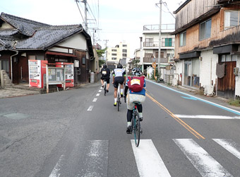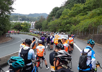 ある程度走ったところでやっと先導がペースを上げて、待ちかねた高速道路の快走サイクリングができるように。片側2車線での1車線規制も無くなり広々走行。速度を上げる前列のロードバイクに離されないよう張り切ってペダルを漕いで付いて行く。レースではないし関門時間に余裕もあるので急いで走る必要はないが、沢山の参加者と走るイベントはテンションが上がるし、小径車でもガンガン走ってやるぞっ!てな感じにアドレナリンが出てやる気モードに。普段はマイペースなソロサイクリングをしているが、たまにはイベントに参加して張り切るのもいいと思った。 |