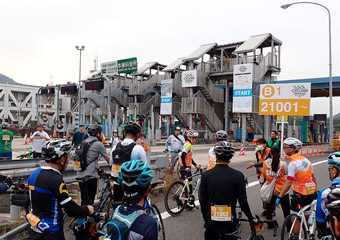 そして7:40頃にやっとイベントスタートの号令。最初にAコース参加者の出走が始まり、少しずつ移動してスタート会場の本線料金所の前へ。約900名いるAコース参加者の出走が完了したところで、待ちに待ったBコースのスタートが7:50過ぎから始まる。Bコースの参加者は約300名いるが、自分は待機列の先頭から3列目に並んでいたので即出走できた。集合会場に到着してからスタートまで2時間半、自宅を出た時間からだと約4時間半。本当に長かった。これが早朝から雨天だったら本当に大変だった。雨に濡れながら長い時間待機するのは流石に苦痛だ。雨に降られないで本当によかった。 |