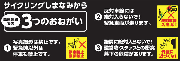 Bコースはスタートから約17km高速道路を走行。2018年に参加した110kmの種目では約34km高速道路を走ったのでちょうどその半分。まぁ17kmでも自転車で高速道路を走る機会なんて他に無いので貴重な経験だ。高速道路での走行時の注意事項として写真撮影の禁止と停車の禁止というのがあり、目に留まりやすいようパンフレット内に大きく表示されていて、プレイベントでもらった記念品が入った袋の中にもその旨を伝えるビラがあった。 |