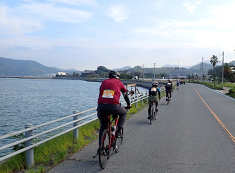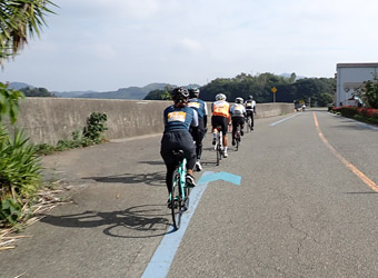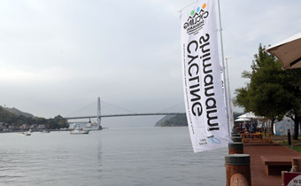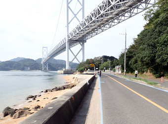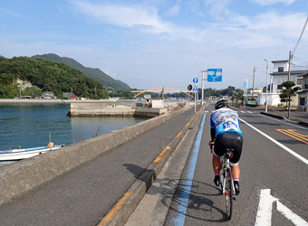 生口島の北岸沿い道路では向かい風が断続的に吹いていて、風の抵抗がしんどくてペースダウン。まだ全行程の中盤辺りなので体力を温存する必要があり、無理はせずに楽なペースの車列に付いて走る。そんな感じに生口島外周路を走り続け、それから生口島と因島を繋ぐ生口橋を渡って因島に入り、今度は因島の外周路を走行。 |