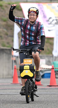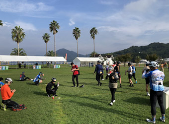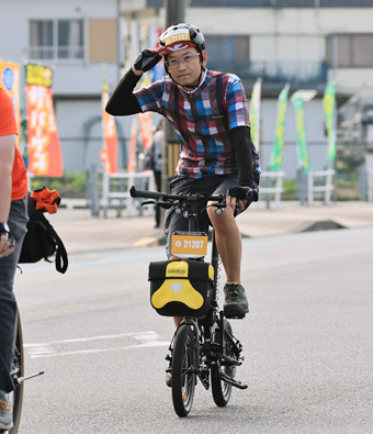 フィニッシュ会場は集合会場と同じ向島運動公園。最後の最後に急勾配の上り坂があり必死にペダルを漕ぎ、公園に入ってフィニッシュゲートをくぐってゴール!!時間は11:00ちょうど。ゲートの先にカメラマンがいるのに気付いたので、ガッツポーズをして有終の美を飾る。自転車用ゼッケンの裏には計測チップが付いていて、フィニッシュゲートを通過した参加者の情報が分かるようになっていて、ゴール時に「広島県東広島市の◯◯さん、フィニッシュです!」とアナウンス。 |