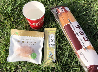 補給食を受け取り緑地の地べたに座って食事休憩。序盤から張り切り過ぎて結構疲れてしまった。正直テーブルとイスが欲しいところだが、参加人数が多いし十分な数を用意するのは無理だろう。思い起こせばこれまでに参加したどのサイクリングイベントでも、エイドステーションでの食事は地べたに座るか立ち食いだった。走行中にトイレに行きたくなると困るので、3種類受け取った補給食のうち口にしたのは菓子パンひとつのみ。残りはフロントバッグに入れておけばいい。 |