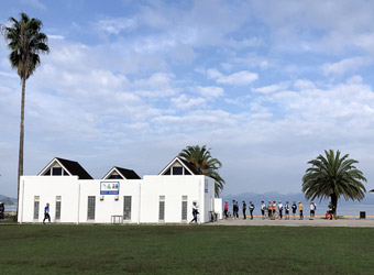 休憩している間にエイドステーションは人でいっぱいになり、補給食を配るテントには長い列ができていた。もしやと思いトイレに行くとやっぱり長い列。仮設トイレの設置は無くビーチの公衆トイレだけなので、明らかにトイレ不足だ。こういう時に腹痛なったらと思うとゾッとする。やはりこの手のイベント参加時は、前日から無駄な飲食は控えるようにした方がいいと思った。 |