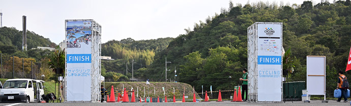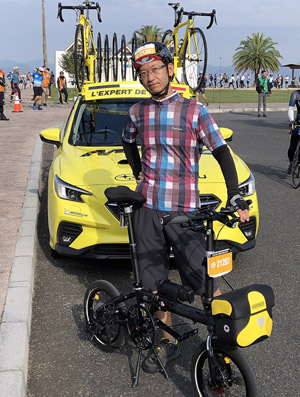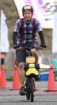 フィニッシュして直ぐにゲートの側に設置された記念撮影用のパネルへ行き、側にいたスタッフに声をかけて写真を撮ってもらう。ここでの記念撮影は外せない。前回参加した時はフィニッシュ会場で完走証を手渡されたが、今回は公式サイトから完走証の画像データをダウンロードする方式になっていた。完走後も特設駐輪場まで自転車を運転するので、A4サイズの完走証をその場で渡されても正直邪魔になるし、ダウンロード方式の方が都合が良い。 |