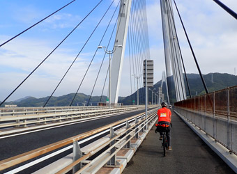 因島と向島を繋ぐ因島大橋へ上がる長い上り坂がしんどかったが、坂道の途中で自分を追い抜いたロード乗りの若い女子2人が可愛かったので、必死にペダルを漕いで2人の後ろに付いて行く。しかし橋に上がったところでスタミナ切れ。2人の背中がどんどん遠くなり、諦めて一気にペースダウン。16インチタイヤで長い上り坂をロードバイクに付いていくのはチョイ無理があった… |
