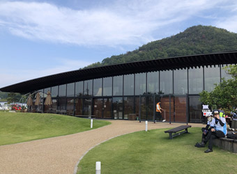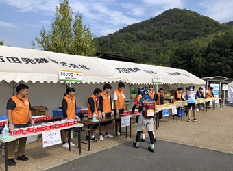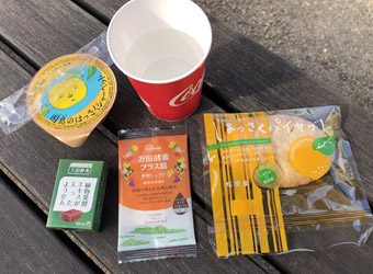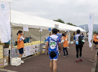 第1エイドと同じく補給食を配るテントで飲食物をいくつか受け取り、パーク内のベンチに座って食事休憩。ベンチの数は少ないので早い者勝ちだ。はっさくパイサブレとシャーベットだけ食べて、空腹にならない程度の補給。トイレはHAKKOパーク施設の立派な建物のトイレを利用。第2エイドはそれほど混雑していなかったしベンチにも座れたので、第1エイドの時よりも落ち着いて休憩できた。 |