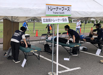食事を済ませたら物販コーナーをさらっと見物。出店ブースは多くなくやはりこぢんまりした印象だ。ブースを見てまわる参加者の姿も少ない。トレーナーブースなるものもあり、参加者が簡易ベッドでマッサージを受けていた。自分も気になる腰回りをマッサージしてもらいたかったが、順番を待つのが面倒くさくて諦める。そんな感じに会場内をウロウロしていたらステージイベントの和太鼓演奏が始まる。 |