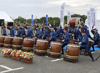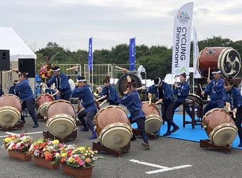 ステージ前には結構な数のパイプ椅子が並べられていたが、和太鼓演奏を着席して観覧しているのは関係スタッフや別の出演者グループが主で、イベント参加者の姿はほとんど無し。やはり2018年の今治フィニッシュ会場と比べて全く盛り上がりが無い。中規模開催だからか、それとも天気が下り坂で雨の心配が出てきたからか、やっぱり尾道会場だからか… ともあれ、普段目にする機会のない和太鼓演奏だし折角なので自分は暫く観覧。 |