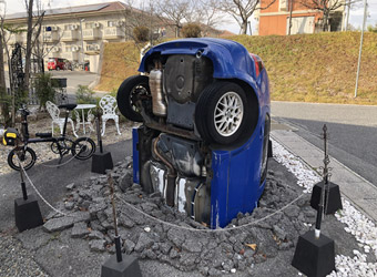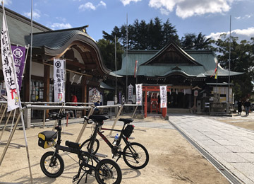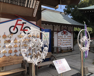 はっさく屋から10kmほど走って次の目的地の自転車神社に11:00到着。自転車神社の境内もいつもより参拝者の姿は少なく、自分達以外にサイクリストの姿は無く粛然とした雰囲気。自転車神社は4度目の訪問になるが、いつも鳥居の前に置かれていた記念撮影用の看板が何故か社務所入口に置かれていたのが残念だった。撮影マナーに問題のあるサイクリストでもいたのだろうか。 |