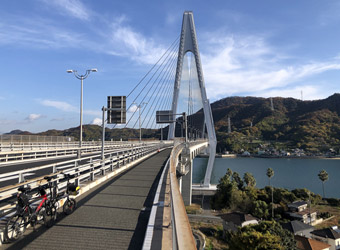 三原市の須波港からフェリーに乗って生口島へ渡り、9:00に沢港からサイクリングスタート。生口島北岸沿いの外周路を数キロ走ってから生口橋を渡り、はっさく屋と自転車神社がある因島に入る。須波港に7:30に着いた時はほぼ無風でそれほど寒くなかったが、島に渡ると風が出ていてやっぱり寒い。それでも厚着しているので上り坂では身体が温まって軽く汗をかき、そして汗が冷えて余計に寒くなり体温感覚が訳分からなくなる。相変わらず冬サイクリングは温度調節が難しい。 |